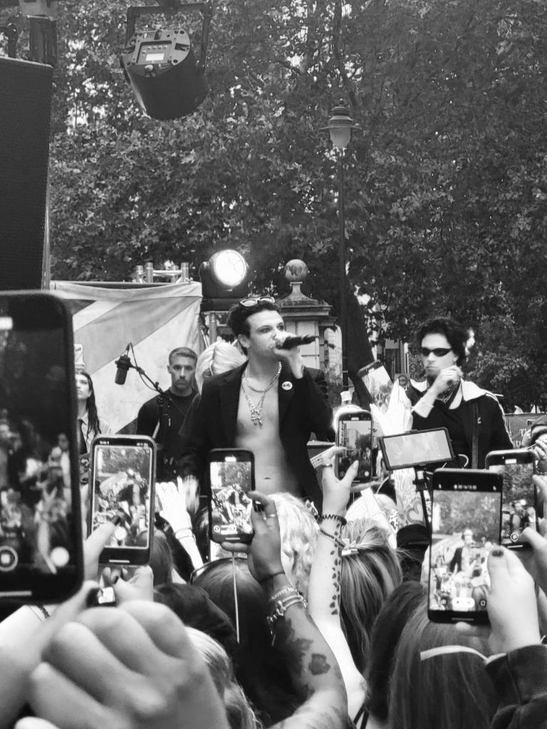 When Dom arrived, he didn’t duck straight inside. He greeted fans in the store, signed bits, took selfies, and as always, made the whole thing feel more like a hangout than a transaction. Later, he took it up a notch with a live performance on a stage set up right there in the middle of Denmark Street. For a few hours, that little stretch of road turned into a street party, part gig, part family gathering, with YUNGBLUD at the centre of it all.