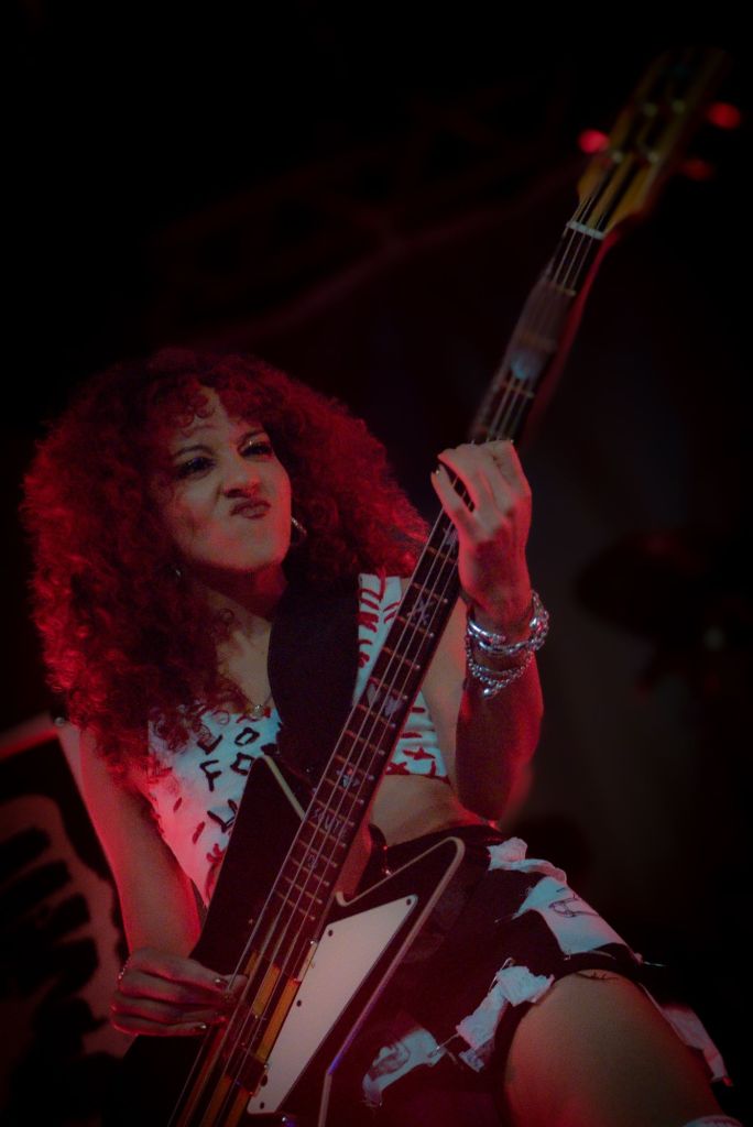 At Epic Studios, the girl’s reputation translated into a stunning live experience. The set opened with a surge of distorted bass and effects-heavy guitar, immediately igniting the crowd. Nova Twins’ sound is famously created without traditional backing tracks or synths, relying instead on intricate pedal work and live manipulation, and that technical creativity was on full display. Each riff felt thick and immersive, filling the venue with a wall of sound that blurred the line between instruments. The stage around each member was packed full of their pedals to amplify their sound.
