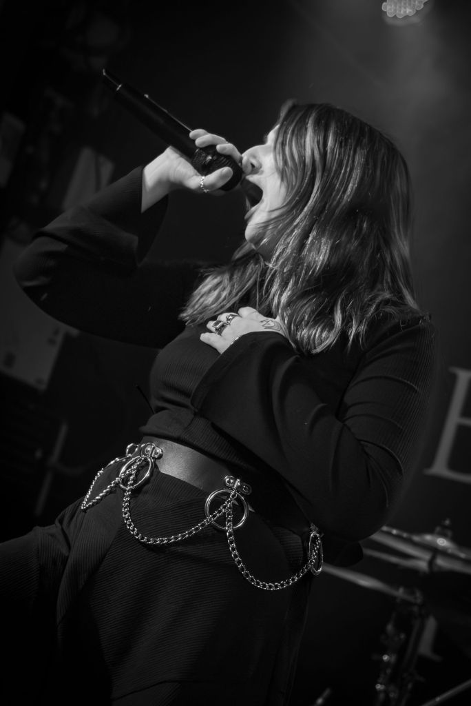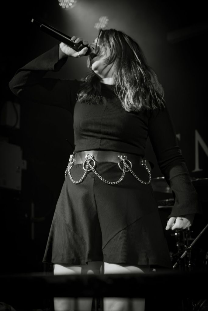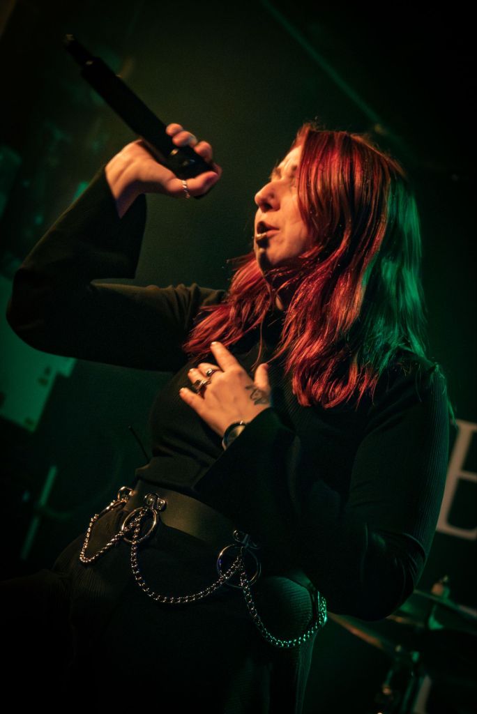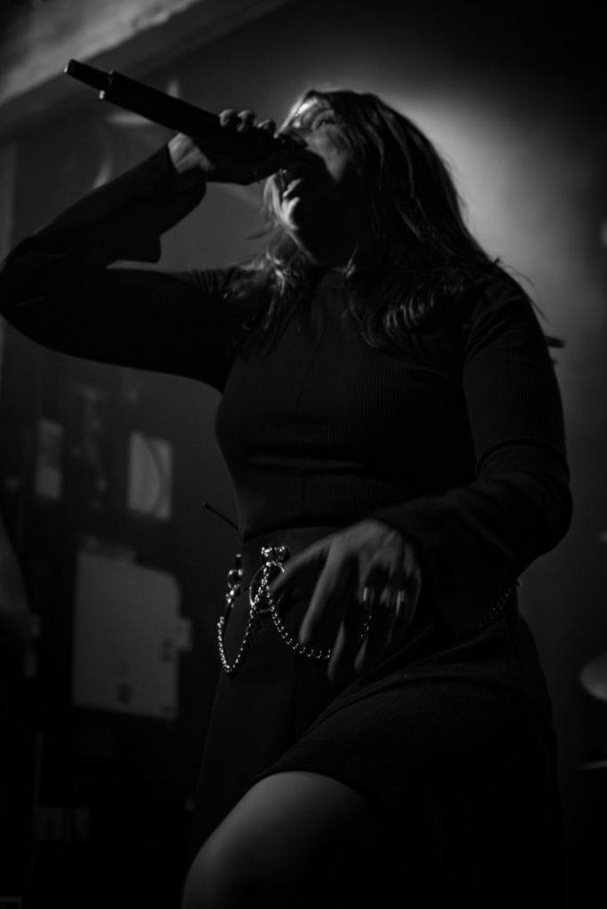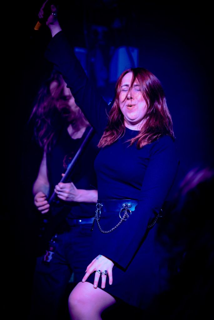 At the centre of it all was Justine Jones, whose commanding stage presence anchored the performance. Switching between guttural screams and sharper, rhythmic delivery, she drove each song forward with intensity. Sammy Urwin complemented this with crushing guitar work, often stepping forward to share vocal duties, adding another layer to the band’s already dense sound. Behind them, David’s guitar textures, Nathan’s heavy bass lines, and Casey’s precise, thunderous drumming combined to create a wall of sound that filled the compact venue.
